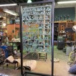 Commissioned by Omaha’s Joslyn Art Museum to fabricate art deco patterns in the new atrium, designed by Sir Norman Foster, to help unify the old section of the museum with the new. Work included several 10 foot bronze space partitions, café signage, and three poster display frames. Given to the Lauritzen Gardens Omaha Botanical Center some years ago when Lauritzen remodeled.