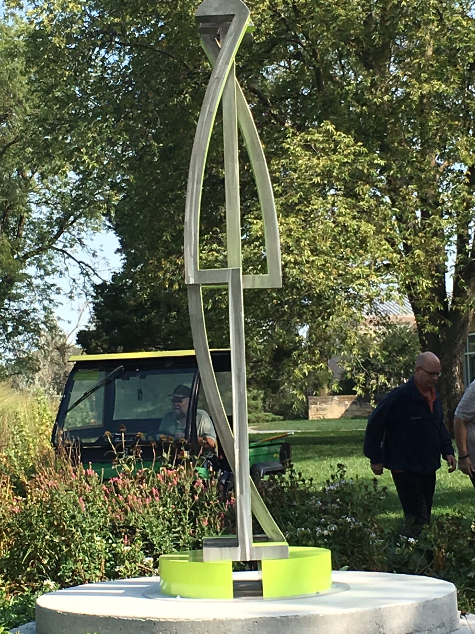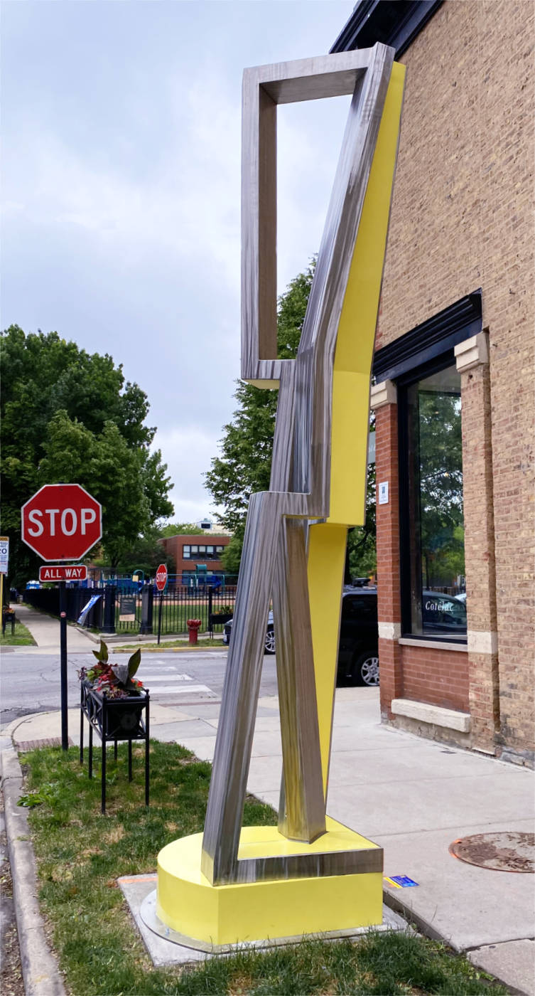 These pieces rely on a balance of positive and negative forms that flow with dynamic changing patterns as the viewer moves around the piece. This interaction is further enhanced by a limited use of color, usually lime green, that compliments the use of sparkling stainless steel.