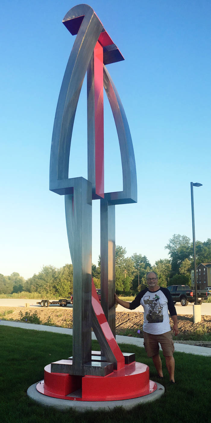 Trivium is the latest sculpture in the Vector Series. This series uses various combinations for four linear forms constructed a circular base fabricated of stainless steel and using a color to further modulate the forms. The interacting negative spaces become as visually strong as the physical structure.